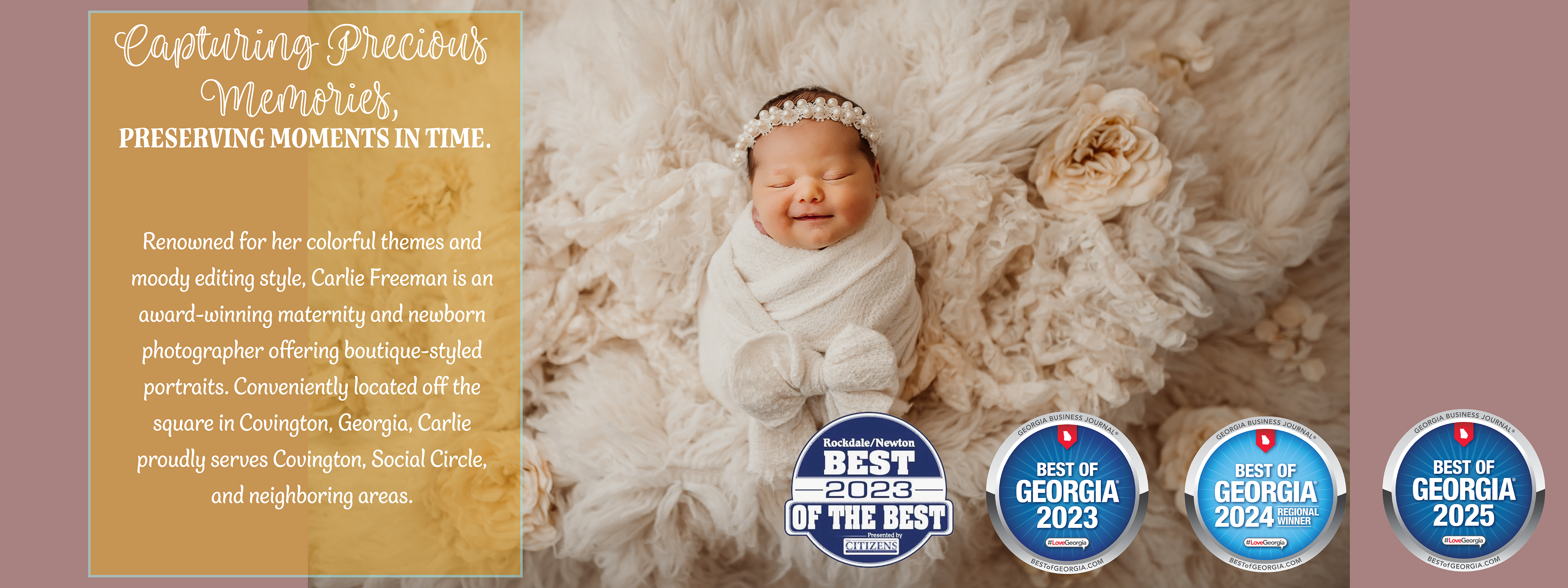 Hello! My Name is Carlie Freeman, a dedicated photographer based in Covington, Georgia. My specialty lies in creating beautifully posed, boutique-style photographs that exude elegance and sophistication. With an intense eye for detail and a passion for perfection, I craft images that are both timeless and captivating. Each session is a carefully curated experience, designed to highlight the unique beauty and personality of my subjects. Whether it’s a newborn, an expectant mother, or a cake smash session, my goal is to deliver stunning visuals that you’ll cherish forever.